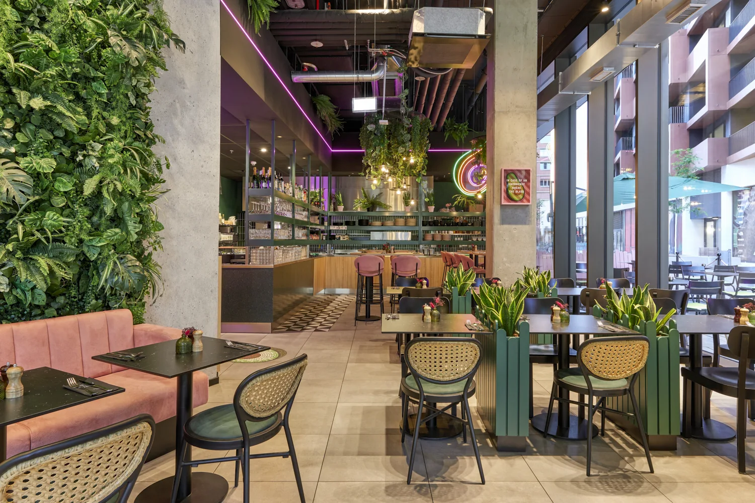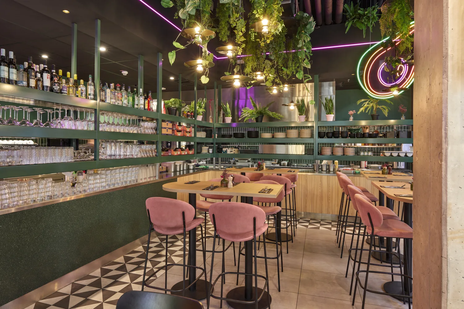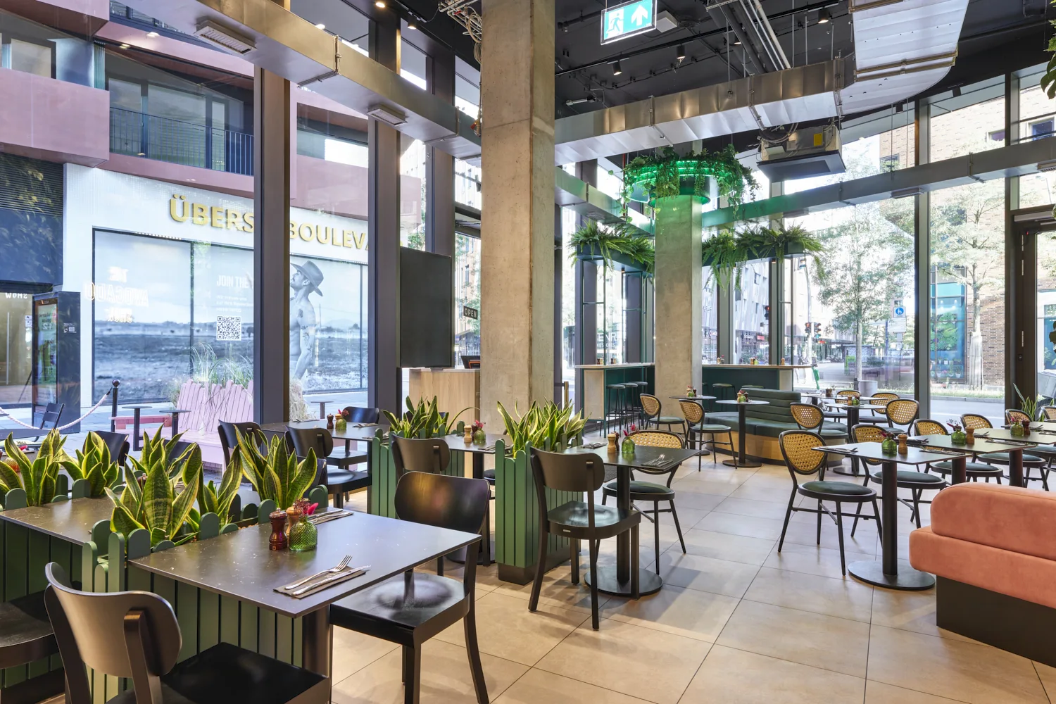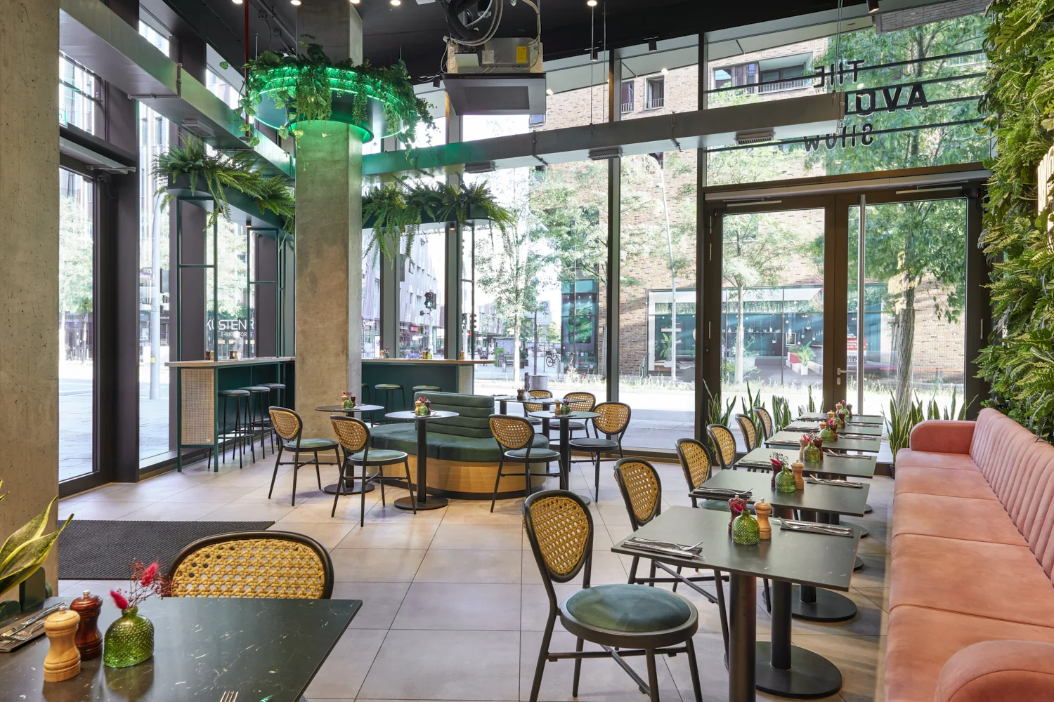 Prägend sind kräftige Grüntöne, gezielte Rosa-Akzente, üppige Begrünung und offene Strukturen, die dem Raum eine lebendige, zugleich geordnete Wirkung verleihen. Das Zusammenspiel aus Farbe, Licht und Raumform definiert eine markante Identität, die die Marke unmittelbar sichtbar macht.
