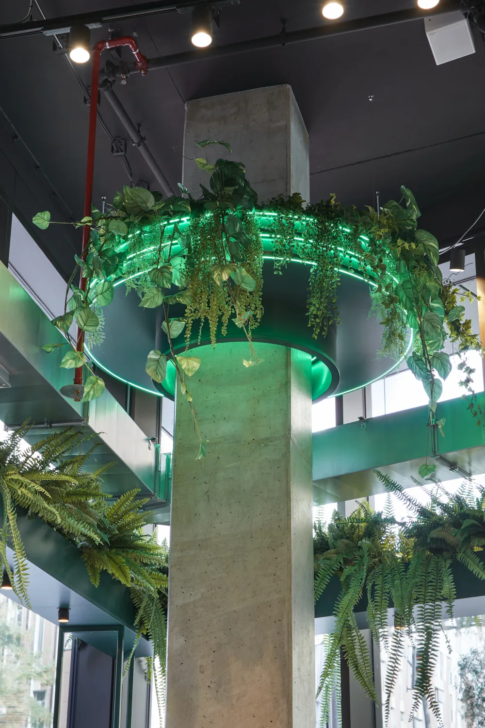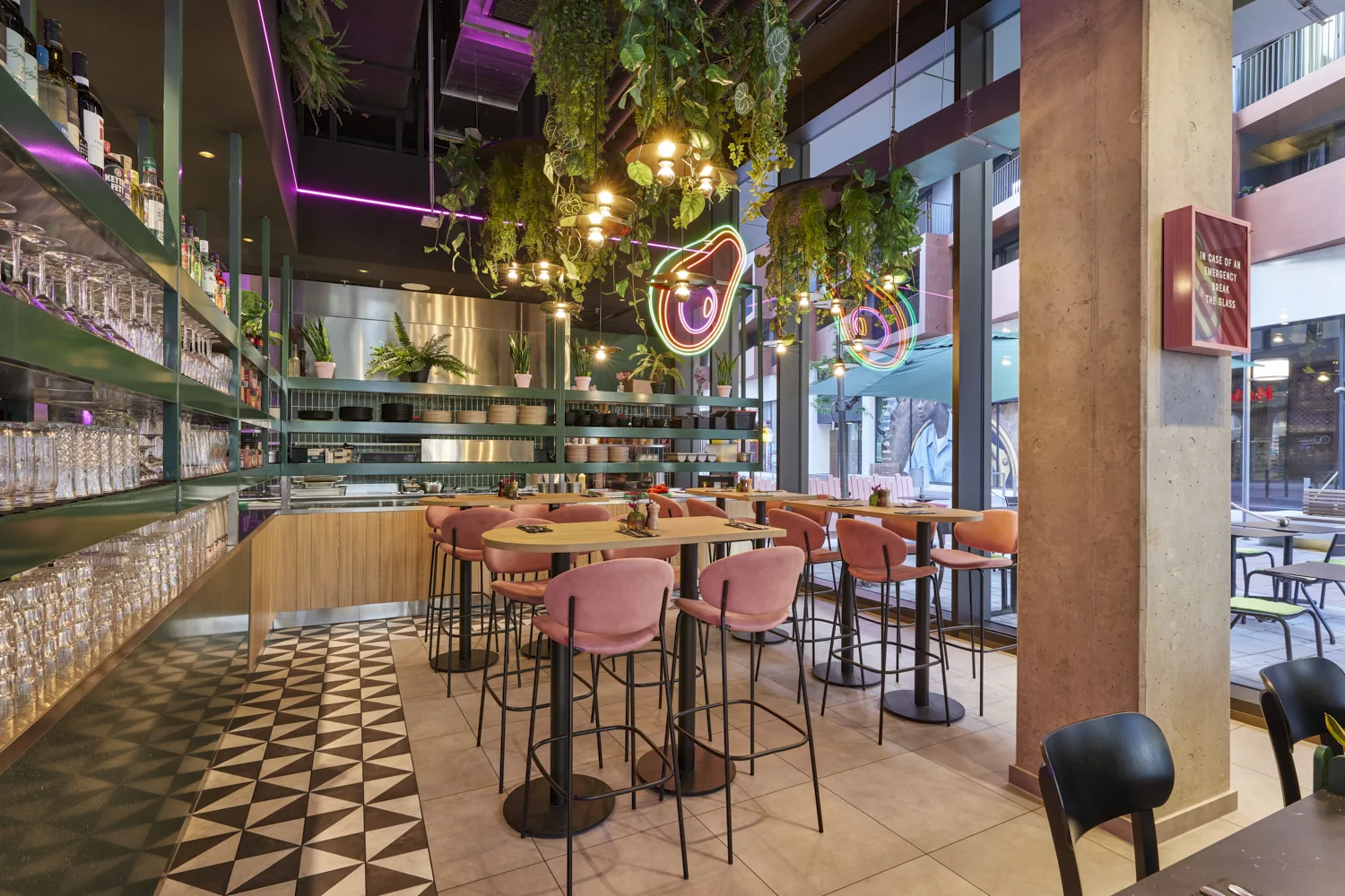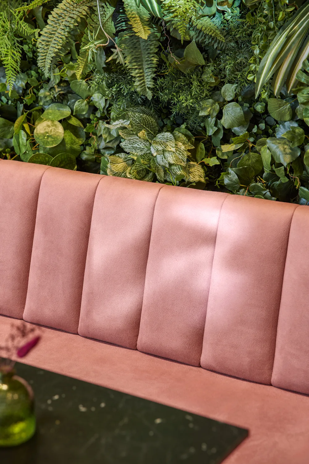 Prägend sind kräftige Grüntöne, gezielte Rosa-Akzente, üppige Begrünung und offene Strukturen, die dem Raum eine lebendige, zugleich geordnete Wirkung verleihen. Das Zusammenspiel aus Farbe, Licht und Raumform definiert eine markante Identität, die die Marke unmittelbar sichtbar macht.