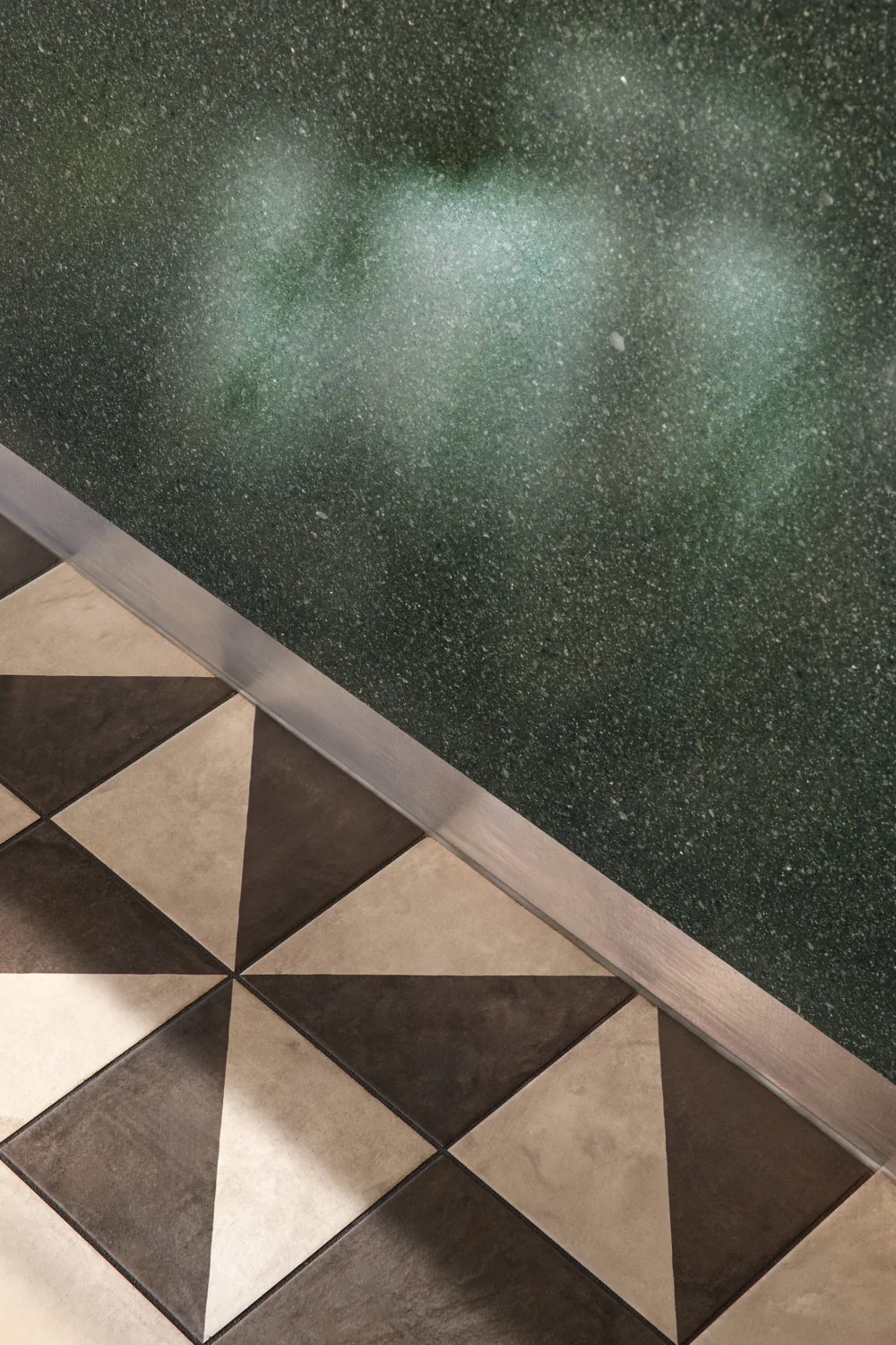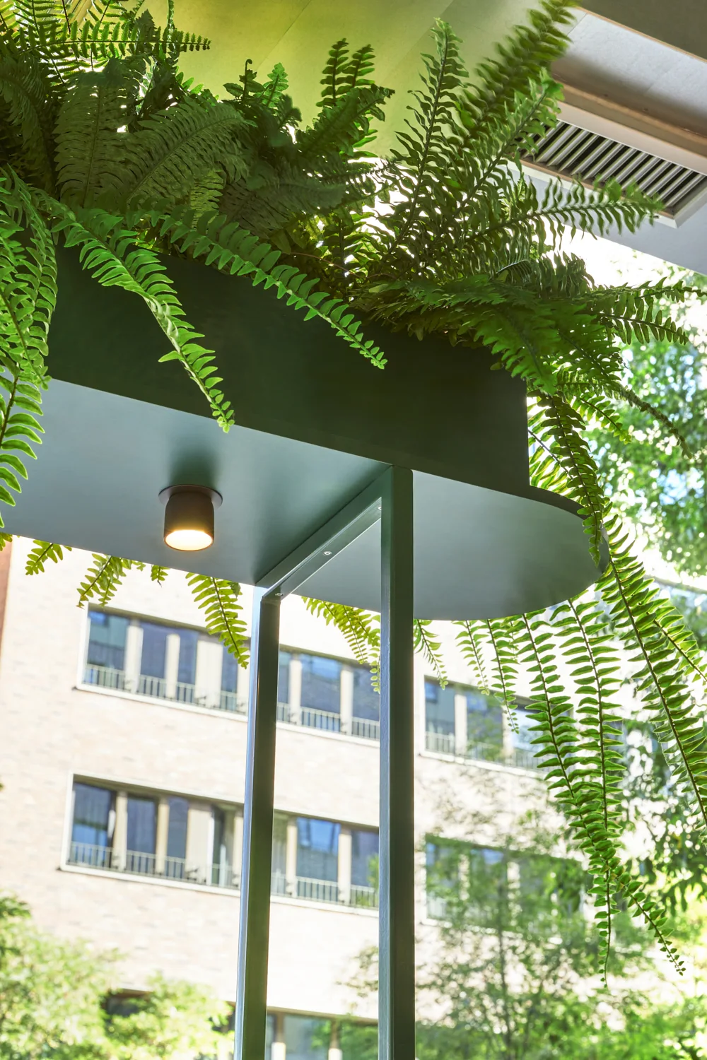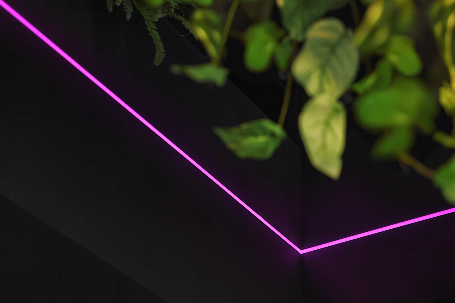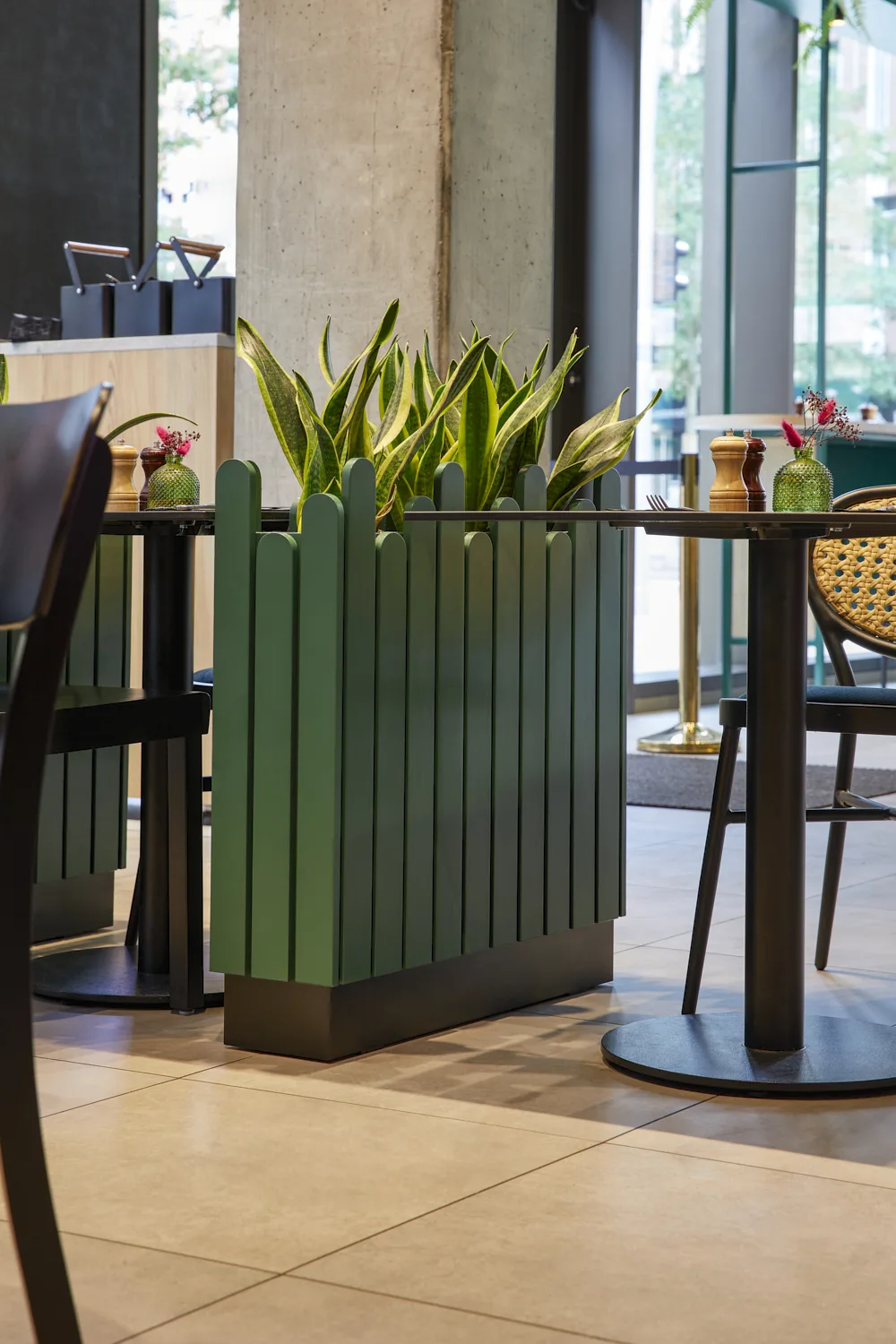 Prägend sind kräftige Grüntöne, gezielte Rosa-Akzente, üppige Begrünung und offene Strukturen, die dem Raum eine lebendige, zugleich geordnete Wirkung verleihen. Das Zusammenspiel aus Farbe, Licht und Raumform definiert eine markante Identität, die die Marke unmittelbar sichtbar macht.