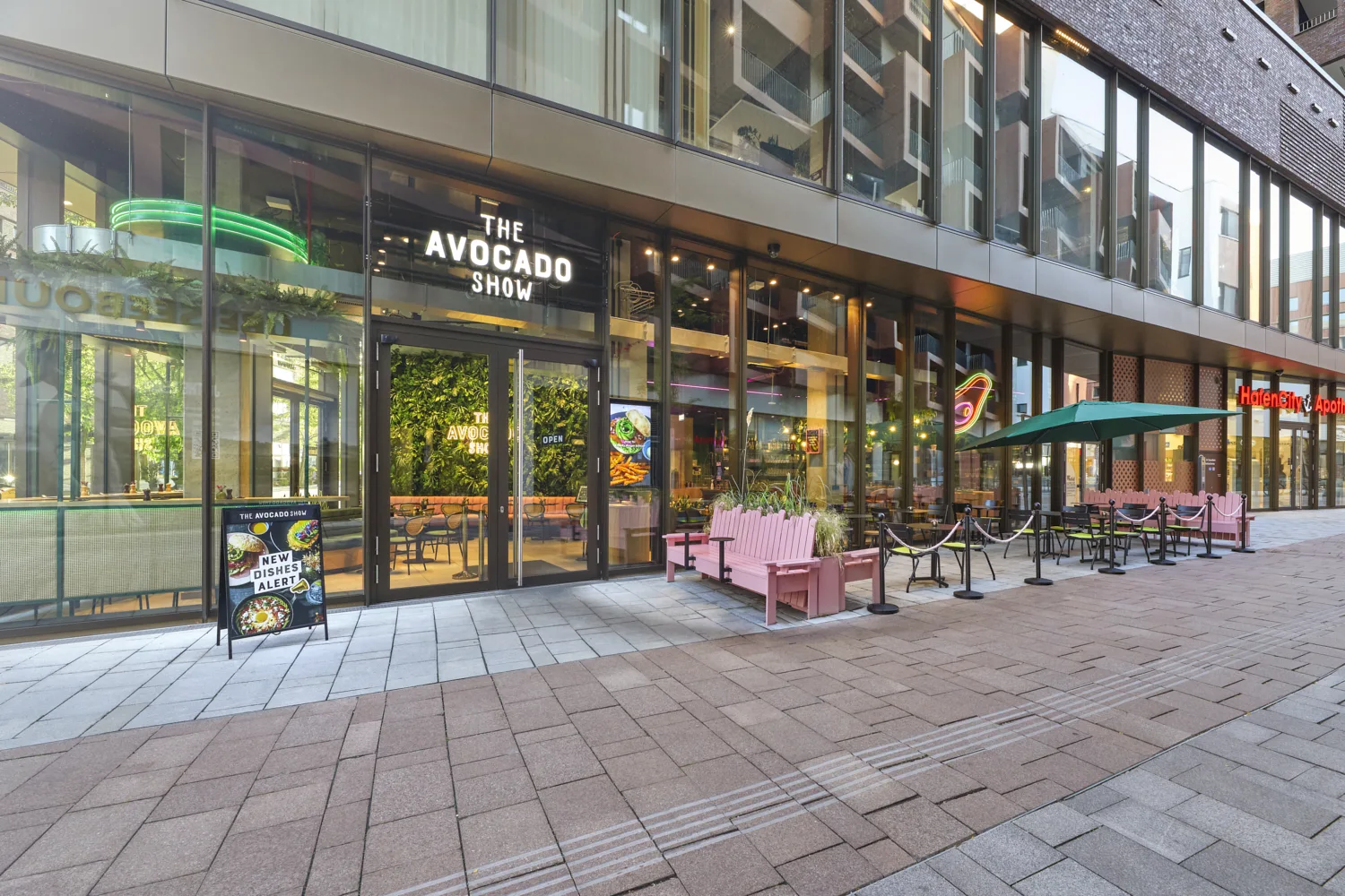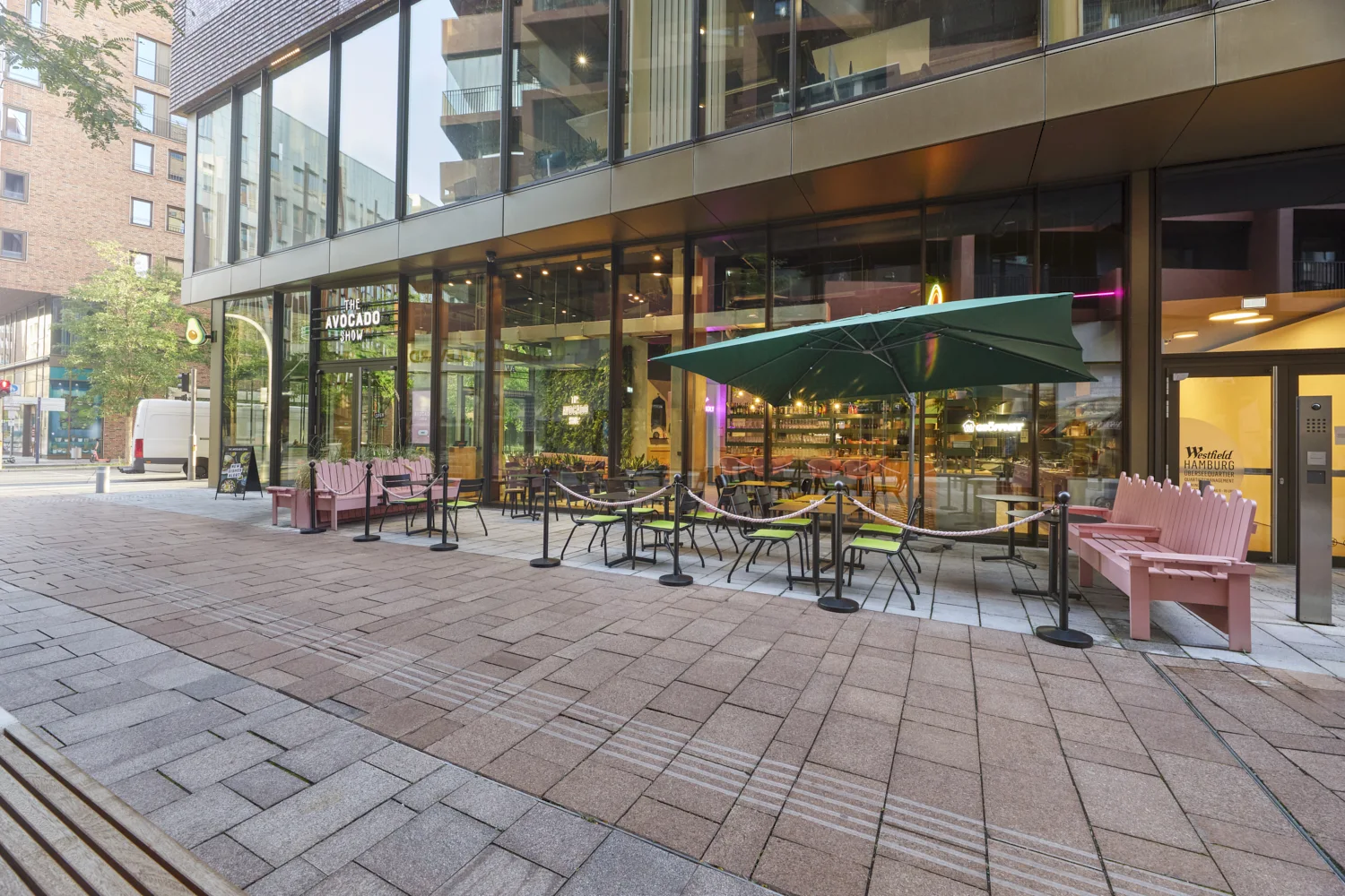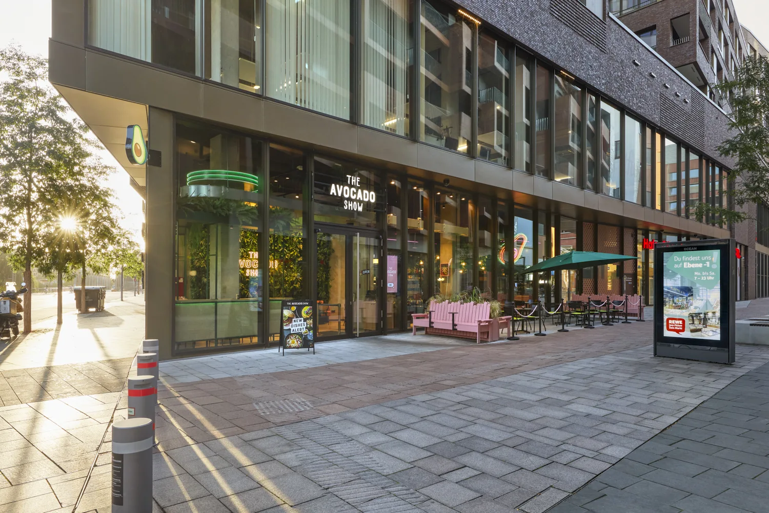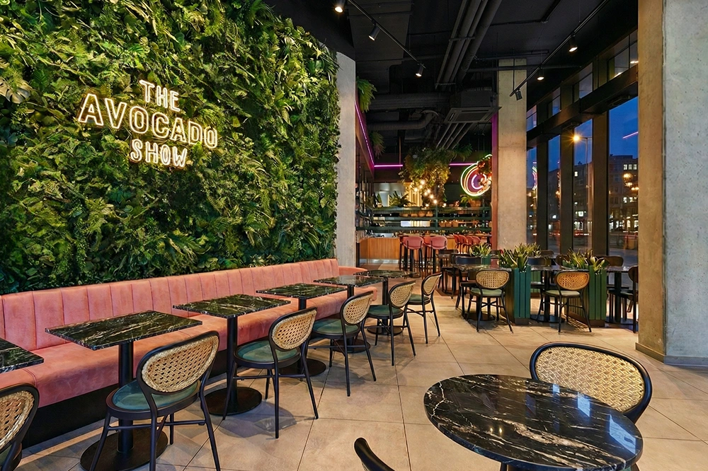 Mit der neuen Fläche von The Avocado Show im Westfield Center am Überseeboulevard entstand ein Gastronomieraum, der durch eine klare Formsprache und ein frisches, modernes Gesamtbild überzeugt. Prägend sind kräftige Grüntöne, gezielte Rosa-Akzente, üppige Begrünung und offene Strukturen, die dem Raum eine lebendige, zugleich geordnete Wirkung verleihen. Das Zusammenspiel aus Farbe, Licht und Raumform definiert eine markante Identität, die die Marke unmittelbar sichtbar macht.